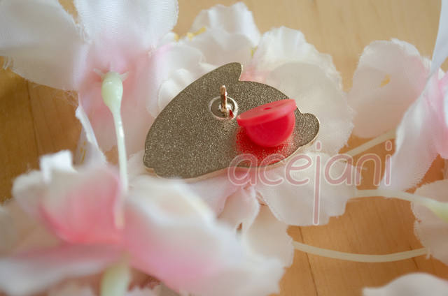 30mm (~1.2") hard enamel pin (gold-plated) with red rubber clasp.